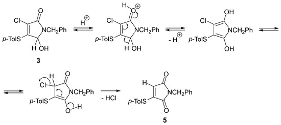 Regarding the mechanism for the observed formation of the unexpected product 5, we can propose initial protonation of the carbonyl oxygen atom of pyrrolinone 3, followed by deprotonation to give the enolic structure. The subsequent elimination of HCl from the corresponding keto-tautomer leads to the formation of a maleimide derivative 5 (Scheme 2).