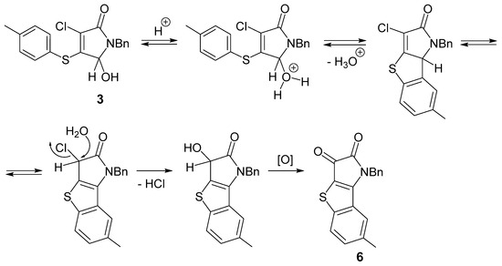 The observed formation of tricyclic compound 6 from pyrrolinone 3 in the presence of sulfuric acid represents an interesting result and requires further detailed study. We can tentatively propose some key steps for this acid-catalyzed transformation (Scheme 3). After the protonation of the OH group at carbon atom C-5, an intramolecular aromatic electrophilic substitution may occur that produces a tricyclic system. An isolated compound 6 may arise as a result of nucleophilic substitution of the chlorine atom and oxidation of the secondary hydroxyl group.