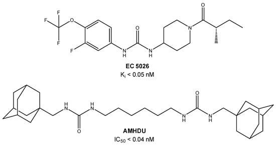 It is known that 1,3-disubstituted ureas are potent inhibitors of human soluble epoxide hydrolase (sEH) [1,2,3,4,5]. Such compounds are currently undergoing clinical (EC 5026, Figure 1) and preclinical (AMHDU, Figure 1) trials and may become a good alternative to opioid analgesics [6,7]. We have previously shown that symmetrical compounds containing two urea groups and two lipophilic fragments linked by an aliphatic spacer are capable of inhibiting soluble epoxide hydrolase in the picomolar concentration range [8]. However, from the point of view of synthetic chemistry, the described method is suitable for obtaining only symmetrical compounds, the properties of which are not always suitable for their use as drugs.