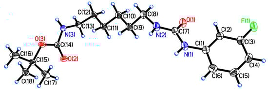 The molecular structure of tert-butyl (6-(3-(3-fluorophenyl)ureido)hexyl)carbamate (3) was determined by single-crystal X-ray diffraction (SC XRD). According to the SC XRD data, 3 crystallizes in the monoclinic Pn space group with a unique complex molecule in an asymmetric unit. The molecule comprises four parts: a main six-membered carbon chain C(8)-C(13), a 3-fluorophenyl ring attached to N(1) (N,N′-disubstituted urea fragment), and a Boc-protecting group bonded to N(3) (Figure 2). All bond lengths and angles are within normal ranges (Tables S2 and S3 in the Supplementary Section). The general molecular conformation is a consequence of the twist of each terminal substituent to the main disubstituted aliphatic diamine. The dihedral angles between the mean plane of the 3-fluorophenyl group (atoms C(1)–C(6)) and the carboxylic group (atoms O(2)–C(14)–O(3)–C(15)) are 56.78(10)°. The orientation of the Boc-protecting group relative to the main chain gives a torsion angle of C(14)-N(3)-C(13)-C(12) = −118.7(2)°.