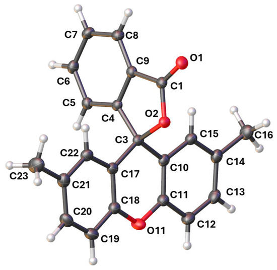 A stirred mixture of 4-methylphenol (0.36 g, 3.3 mmol) and phthalic anhydride (0.30 g, 2.0 mmol) in methanesulfonic acid (1.00 g, 0.68 mL, 10.0 mmol) was heated to 90 °C in a boiling tube for 4 h. Upon cooling to room temperature, water (20 mL) was added, and the resulting mixture was triturated with a glass rod until a tan-coloured solid was formed. The supernatant liquid was neutralised by the portionwise addition of solid sodium bicarbonate. The crude product was filtered off under suction, washed with water (2 × 5 mL), and recrystallized from acetone. A colourless crystalline solid was formed; this was filtered off under suction and washed with ice-cold acetone (2 × 2 mL) to afford product 2 (0.15 g, 28%), mp 251–253 °C (lit. [4] 250–252 °C). IR (ATR) 3059.4, 3016.8 (ArCH), 2920.3 (CH3), 1756.8 (C=O), 1610.5, 1486.3, 1106.7 cm−1; 1H NMR (400 MHz, d6-DMSO); 8.06 (1H, ddd, J = 7.4 Hz, 1.4, 0.8 Hz, ArH), 7.80 (1H, td, J = 7.5, 1.4 Hz, ArH), 7.75 (1H, td, J = 7.5, 1.1 Hz, ArH), 7.29–7.33 (4H, m, ArH), 7.27 (1H, dt, J = 7.5, 0.9 Hz) ArH), 6.60 (2H, dt, J = 1.7, 0.9 Hz, ArH), 2.17 (6H, s, CH3); 13C NMR (100 MHz, d6-DMSO); 169.3 (C=O), 153.5 (ArCq), 148.9 (ArCq), 136.4 (ArCH), 133.6 (ArCq), 132.3 (ArCH), 130.8 (ArCH), 127.7 (ArCH), 125.7 (ArCq), 125.5 (ArCH), 124.4 (ArCH), 118.7 (ArCq), 117.4 (ArCH), 82.2 (Cq), and 20.6 (CH3). HRMS (ESI+) m/z (%) Calcd. for C22H16O3Na 351.0992, found 351.0998 [M+Na] (100).
