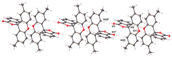 The structure displays several non-classical intermolecular CH···O interactions. A pair of interactions are found between both H6 and H7 with O2 at H···O distances of 2.65 and 2.55 Å (C···O separations of 3.2503(14) and 3.1986(15) Å), respectively, resulting in 1D chains running along the crystallographic a-axis (Figure 3). Two sets of dimer-forming CH···O interaction are also seen; between H5 and O11 and between H22 and O1, at H···O distances of 2.45 Å (C···O separations of 3.3715(15) and 3.3875(15) Å) (Figure 4). The dimer-forming interactions result in the chains of molecules being linked into two-dimensional sheets in the ab-plane (Figure 3).