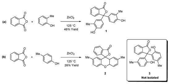 Reaction of phthalic anhydride with (a) 2-methylphenol and (b) 4-methylphenol mixed with ZnCl2 at 125 °C for 8 h.