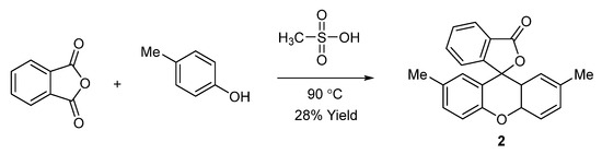 In this work, we describe a short study to examine whether 2′,7′-dimethyl-3H-spiro[isobenzofuran-1,9′-xanthen]-3-one (2) or 3,3-bis(2-hydroxy-5-methylphenyl)isobenzofuran-1(3H)-one (3) is the isolable product from the reaction of phthalic anhydride and 4-methylphenol under milder conditions than reported in older studies [3,4]. Our findings align with the outcome of closely related reactions from the earlier 20th century; fluoran 2 was the sole isolated product (Scheme 3), and this compound has been characterised using X-ray crystallography for the first time.