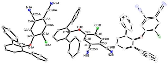 The molecular structure of 4-([1,1′:3′,1′′-terphenyl]-2′-yloxy)-5-chlorophthalonitrile (left) and overlayed independent molecules A and B (right). Displacement ellipsoids are drawn at the 30% probability level. Hydrogen atoms are omitted.