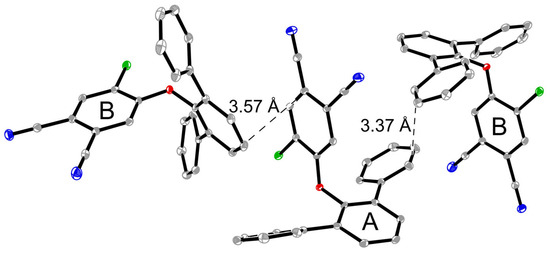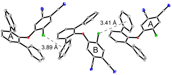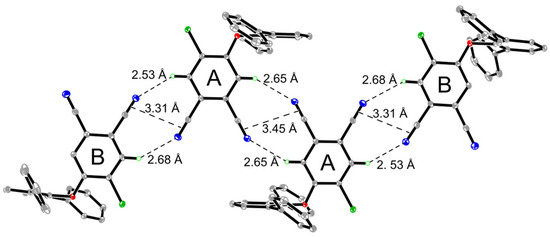 Indeed, A and B molecules in a crystal have a non-equivalent environment. The main structural motif is the formation of tetramers (B-A-A-B) due to strong π…π interactions of cyano groups, additionally stabilized by H…N contacts (Figure 2). It should be noted that, according to the literature, similar chloro-substituted phthalonitriles with a directly introduced phenoxy fragment also exhibit the presence of two independent molecules, A and B, in the unit cell [6,7,8]. However, when the fragment is introduced via a spacer bridge, the unit cell contains only one molecule [9].