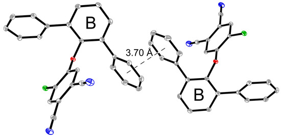 Another significant structural motif in the crystal of 4-([1,1′:3′,1′′-terphenyl]-2′-yloxy)-5-chlorophthalonitrile should be noted. The chlorine atom of molecule B is located almost above the center of the aromatic system (Figure 4 (bottom)). All Cl…C distances are largely equalized and are 3.59–3.77 Å. The most important thing is that the distance between the chlorine atom and the center of the phenyl substituent (3.41 Å) is less than the sum of the van der Waals radius of the chlorine atom (1.80 Å) [13] and the half-width of the aromatic molecule (1.77 Å—the radius of the sp2-carbon atom) [14,15]. Thus, an intermolecular Cl…π interaction is realized in the crystal. In turn, for the chlorine atom in molecule A, a slightly different situation is observed. Firstly, it is significantly shifted relative to the center of the phenyl substituent of the neighboring molecule. The Cl…C distances are 3.70–4.53 Å. Secondly, the distance to the center of the aromatic system (3.89 Å) exceeds the sum of the van der Waals radius of the chlorine atom and the half-width of the aromatic molecule (3.57 Å). However, some studies [16,17] show that such geometry may still indicate the presence of intermolecular Cl...pi interactions. Similar contacts appear in f 4-chloro-5-(2,6-di-iso-propylphenoxy)phthalonitrile [6].