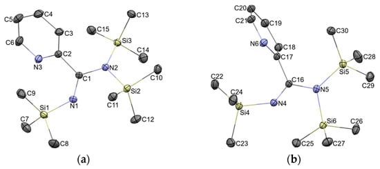 The title compound 1 crystallizes in space group P21/n, the most common space group for racemic organic and metal–organic compounds because this enables the highest density of packing (Dcalc = 1.075 g/cm3), but with Z′ = 2. This means that two different conformations share the asymmetric unit that is repeated by the lattice symmetry elements (-centers, n-glides and 21-screw axes). These are depicted in Figure 2a,b and will be called the C1 and C16 conformers. The two adopted conformations in the crystal lattice differ by subtle variations concerning the rotations of the Si(CH3)3 methyl groups as well as that of the 2-pyridyl ring with respect to the respective central C atoms. An analysis of the void spaces finds four spheres per unit cell together accounting for 42 Å3, corresponding to 1% of the total volume, and far too small to accommodate any solvent, consistent with the spontaneous crystallization of the vacuum-distilled oil.
