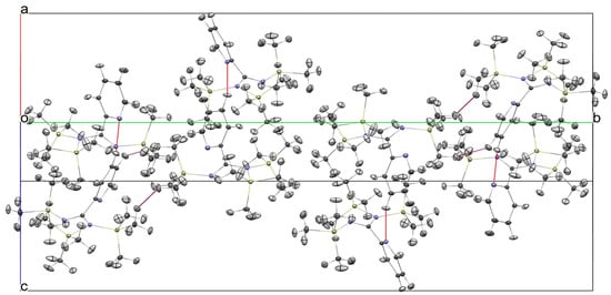 A depiction of the lattice structure of 1 is provided in a unit cell diagram (Figure 3). Important intermolecular contacts, including non-classical C–H∙∙∙N hydrogen bonds are reported in Table 2. There is a chain of H-bonds that links the pyridyl N3/N6 atoms to the pyridyl C19/4–H atoms, that is, to the C para to the N in each ring. Thereby, the two distinct molecules are linked to each other in an infinite chain (in Etter notation) [26]. Given the high symmetry displayed in the other known persilylamidine SC-XRD structures (all of which are either Z′ = 1 or Z′ = ½), it may be speculated that the Z′ = 2 packing adopted in 1 represents a compromise between the very uniform molecular structures induced by the high steric pressure at the amidine centers and the adoption of this H-bonded chain. Of course, these are non-classical H-bonds, but especially the d(H∙∙∙A) of ~2.4 Å and ∠D–H∙∙∙A of ~161° place them near the upper limit of “weak” H-bonds in the classification of Jeffrey [27]. Additional, weaker, dispersive interactions are found linking between H-bonded chains of molecules, forming double contacts (pyridyl) H20∙∙∙H9C (Si(CH3)3) and (Si(CH3)3) H30A ∙∙∙H8C (Si(CH3)3).