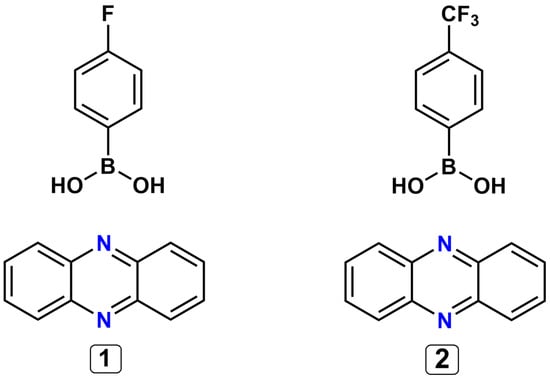 The CSD database (version 5.46, November 2024) [9] and literature survey indicates no cocrystals have been reported for either (4-fluorophenyl)boronic acid (FBA) or (4-(trifluoromethyl)phenyl)boronic acid (TFBA) with the phenazine (PZ) molecule. However, the database reports two cocrystals of FBA, one with pyridin-1-ium-4-carboxylate (CSD refcode PUNZEG) [10] and another with a 1,8-naphthyridine ligand (CSD refcode TAZKUD) [7]. Moreover, the database also shows the presence of one cocrystal of TFBA with a boroxine-(N,N-dimethylmethanamine)-antimony complex (CSD refcode YUGSEA) [11]. In addition, a few cocrystals and their hydrates of (4-chloro/bromo/iodophenyl)boronic acids with PZ molecules have also been previously determined (CSD refcodes RORNOD, RORNUJ, RORPAR, and RORPEV) [8]. These cocrystals containing heavier halogen atoms (Cl, Br, I) were designed to evaluate the role of more polarizable halogen atoms in exhibiting halogen bonding, particularly in the presence of the self-association of phenylboronic acids via hydrogen bonding. As part of our ongoing project on designing various organoboron-based crystalline materials via noncovalent procedures [5,12], the focus of our work is to understand the supramolecular features of two newly synthesized cocrystals of the less polarizable fluorine-containing FBA (1) and TFBA (2) with the same PZ molecule, as provided in Figure 1 (see also Supplementary Materials).