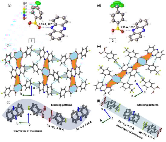 Crystal structure and packing arrangement of molecules in cocrystals 1 (a–c) and 2 (d–f). Thermal displacement ellipsoids are plotted at the 50% probability level in (a,d). Dotted blue lines indicate intermolecular interactions. The O-H∙∙∙O bonded phenylboronic acid dimeric motifs are shaded in a light blue color. The C-H∙∙∙O supported O-H∙∙∙N and weak F∙∙∙π motifs are shaded in orange and gray colors, respectively.