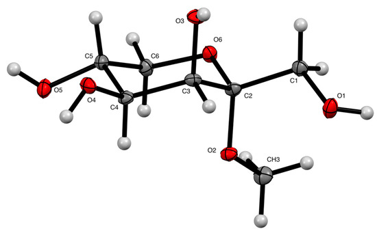 Acquiring comprehensive structural information is essential to understand the biological effects of d-tagatose. Nevertheless, owing to the mutarotation of d-tagatose, investigating its conformation in solution poses a considerable challenge [14]. Consequently, X-ray crystallographic analysis offers a valuable method for obtaining conformational data on d-tagatose. For example, X-ray crystallographic structures of α-d-tagatopyranose [15,16], 1,2:3,4-di-O-isopropyidene-α-d-tagatofuranose [9], and 1,3,4,5-tetra-O-acetyl-α-d-tagatopyranose [17] have been reported. These examples are all pyranose or furanose forms, featuring a free anomeric hydroxy group. However, to the best of our knowledge, there are no reports on the X-ray crystallographic structures of its glycosides. The simplest d-tagatopyranoside is methyl d-tagatopyranoside, which was first documented by Khouvine et al. [18]. Subsequently, Angyal et al. conducted NMR analyses of both methyl α-d-tagatopyranoside and β-d-tagatopyranoside [14,19]. Thus, the available structural information on methyl α-d-tagatopyranoside is limited. Herein, we report the synthesis of methyl α-d-tagatopyranoside (1) in a single step from d-tagatose, along with its X-ray crystallographic structure, marking the first successful example of d-tagatopyranosides.
