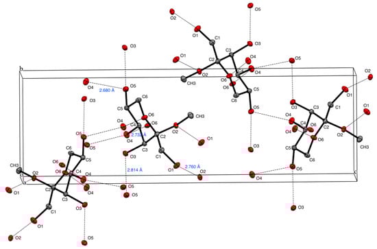 Slow evaporation of the solvent from a solution of compound 1 in MeOH resulted in the formation of colorless crystals that were suitable for X-ray diffraction analysis. The structure of compound 1 was solved and refined using OLEX2 [20] in conjunction with SHELXT [21] and SHELXL [22]. Figure 2 presents an ORTEP drawing of the X-ray crystallographic structure of compound 1, indicating a 5C2 conformation. Figure 3 and Table 1 detail the intermolecular hydrogen bond parameters of compound 1, which include four intermolecular hydrogen bonds in compound 1: O1-H···O2′, O3-H···O5′, O4-H···O6′, and O5-H···O4′.