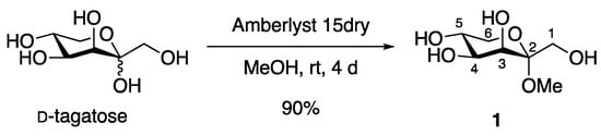 Methyl α-d-tagatopyranoside (1) was synthesized using commercially available d-tagatose, as depicted in Scheme 1. Treatment of d-tagatose in MeOH with Amberlyst 15dry, a polymeric acid catalyst, resulted in the formation of methyl α-d-tagatopyranoside (1) in 90% yield, along with other isomers of methyl glycosides, including methyl β-d-tagatopyranoside (5%). Amberlyst 15dry offers a safer and more manageable alternative for the removal of acid catalysts than the previously employed methanolic hydrogen chloride in the synthesis of glycoside 1 [18,19]. The 13C NMR spectrum of product 1 in D2O solution was consistent with the literature (Figure S2b) [14]. Further spectroscopic analyses, including 1H NMR, 1H-1H COSY, HSQC, and HMBC spectra, as well as IR and MS spectra, confirmed the structure of compound 1. However, the NOESY spectrum of compound 1 did not provide three-dimensional information because of the excessively close or overlapping correlation peaks (Figure S6).