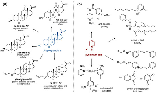 (a) Allopregnanolone and derivatives with biological activities [3,8]. (b) Pyridinium salts with biological activities reported [18,19,20,21,22,23,24].