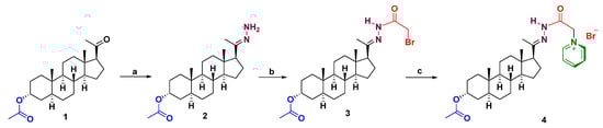 Synthesis of allopregnanolone 17-hydrazineyl-2-oxoethyl pyridin-1-ium bromide 4: (a) NH2NH2·H2O, CH2Cl2, rt; (b) bromoacetyl bromide, Et3N, CH2Cl2, 0 °C; (c) pyridine, rt.