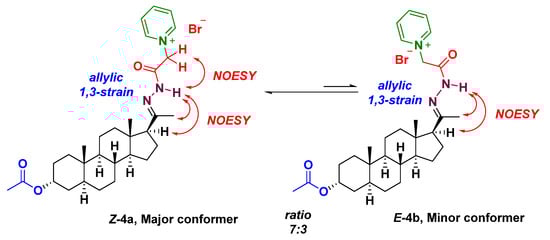 Pyridinium salt 4 undergoes slow conformational flipping in solution at ambient temperature, as revealed by the analysis of the crude reaction by 1H NMR, specifically in the form of 4a and 4b conformers in a 7:3 ratio. Two-dimensional NOESY experiments in CDCl3 allowed for differentiation between the 4a and 4b conformers, which are favored in a ratio of approximately 7:3. Key signals (cross-peaks) of conformer 4a was observed at δ 11.06 and δ 2.03, indicating spatial correlations between the NH proton and 3H-21; observations at 11.06 and 2.38 indicated the interaction between NH proton and H-17; finally, a cross-peak was observed at δ 11.06 (NH) and 6.27 (CH2). All these signals are consistent with the conformer proposed. On the other hand, a characteristic signal of minor conformer 4b was observed at δ 9.77 and 2.03, which represents the corresponding correlation of NH/3H-21. The analysis of the cross-peaks at δ 9.77 (NH) and 2.38 (H-17) confirmed the interaction between these protons. This behavior could be explained by the E vs. Z amide bond rotation, favoring conformer 4a, while N—N single-bond rotation is restricted by an allylic 1,3-strain consequence as shown in Scheme 2.