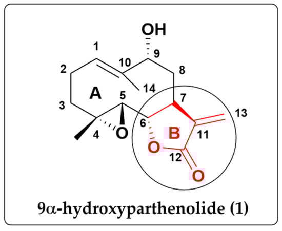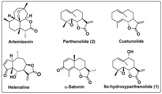 Sesquiterpene lactones are a class of natural compounds found in various plants, particularly in the Asteraceae family [3,4]. These types of derivatives are of significant importance in medicine due to their diverse biological activities and have candidates in various phases of clinical trials such as parthenolide, costunolide, helenalin, and artemisinin (Figure 1) [5,6,7]. Parthenolide (2) is a sesquiterpene lactone originally purified from feverfew shoots [8]. It is used in the treatment of fever, migraines, and rheumatoid arthritis and as an anti-inflammatory agent [9,10,11]. It has shown powerful anticancer activity [12,13].