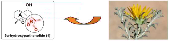 As part of the Moroccan plant development program [14,15,16], Anvillea radiata, an invasive perennial weed, has been particularly studied. Easily accessible, it constitutes a renewable source of sesquiterpene lactones such as 9α-hydroxyparthenolide [16]. This molecule is directly isolated with good yield from the aerial part of the plant (Figure 2) [16,17].