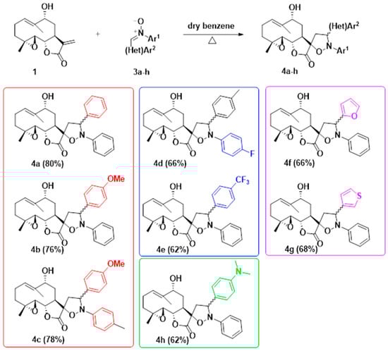Spiro-isoxazolidine derivatives of 9α-hydroxyparthenolide were successfully synthesized by a 1,3-dipolar cycloaddition reaction using various 3ah nitrones. These nitrones 3ah were obtained according to the procedure previously reported in the literature. This involves reducing nitroaryls in the presence of zinc and acetic acid to give the corresponding arylhydroxylamines. These were then condensed with various aromatic aldehydes [18].