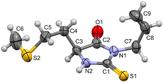 Amino acid-derived 2-thiohydantoins exhibit a variety of biological activities, such as antimicrobial [6], antiviral [7], anticancer [8], antimutagenic [9], and neurotropic [10], and are the subject of numerous preclinical investigations. The body of work conducted so far highlights the significance of these compounds in the effort to obtain novel bioactive compounds and therapeutics. Since hydantoins exhibit a plethora of biological activities and preclinical biological testing consumes a lot of time and resources, it is difficult to screen for the full spectrum of their bioactive potential. It is, therefore, highly beneficial to have published libraries of small molecules that are readily available for in vitro, in vivo, or even in silico screening. For this reason, in this study, we report the synthesis and structural characterization of an l-methionine-derived 2-thiohydantoin derivative, 5-(2-methylsulfanylethyl)-3-prop-2-enyl-2-sulfanylideneimidazolidin-4-one. The structure of the compound is fully characterized by NMR and IR spectroscopy, as well as X-ray diffraction analysis.