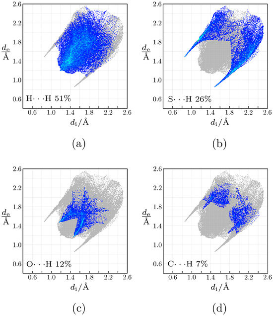 Fingerprint plots of 5-(2-methylsulfanylethyl)-3-prop-2-enyl-2-sulfanylideneimidazolidin-4-one: (a) H···H contacts; (b) S···H contacts; (c) O···H contacts; (d) C···H contacts.