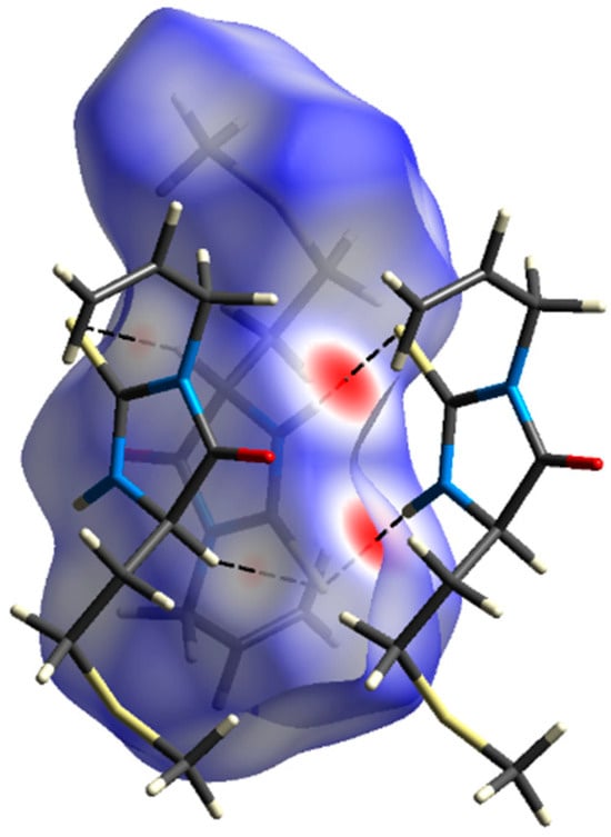 Hirshfeld surface analysis (Figure 2) reveals that most intermolecular contacts are found between hydrogen atoms (51%), followed by S∙∙∙H (26%), O∙∙∙H (12%), and C∙∙∙H (7%). Calculation of enrichment ratios [13] shows that, except H∙∙∙H contacts (EHH = 0.9), all other mentioned are favored in the crystal structure (EOH = 5.8, ESH = 1.2, ECH = 1.2). For the largest proportion of the Hirshfeld surface, it is found that dnorm ≥ 0 holds, meaning that crystal packing does not involve many short intermolecular contacts. The exception is N2–H2∙∙∙S1i hydrogen bond (symmetry operation (i) −x + 2, −y + 1, −z + 1), which shows prominent red patches (dnorm < 0) on the Hirshfeld surface in the proximity of donor and acceptor atoms (Figure 3). In the fingerprint plot, this interaction is visualized as a very sharp pair of spikes. Geometrical parameters of this interaction are N2–H2 = 0.81(2) Å, H2···S1i = 2.56(2) Å, N2···S1i = 3.3696(18) Å, N2–H2···S1i = 174(2)°. Less prominent are red patches corresponding to short contacts C3–H3∙∙∙S1ii (symmetry operation (ii) −x + 1, −y + 1, −z + 1).