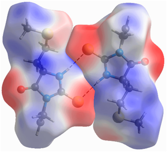 Every molecule is surrounded by six closest neighbors in the crystallographic ab plane. The strongest interaction (–51 kJ mol−1) is mediated through the mentioned N2–H2···S1i hydrogen bond formed between inversion-related molecules. The high electrostatic contribution to the stabilizing energy of this interaction is expected due to strong electrostatic complementarity between molecules, as visualized by Hirshfeld surfaces of the neighboring molecules decorated with electrostatic potential (Figure 5). Other interactions in this plane have significantly higher dispersion than the electrostatic component, but they can hardly be ascribed to some specific atom–atom interaction type. Their energies are in the range of –13 to −38 kJ mol−1. There is only one interaction between layers that has comparable energy (−20 kJ mol−1) to those found within the layer. This interaction has a similar contribution of electrostatic and dispersion terms.