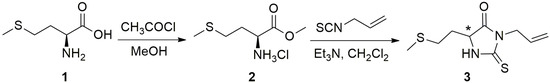 Synthesis of the amino acid-derived 2-thiohydantoin, 5-(2-methylsulfanylethyl)-3-prop-2-enyl-2-sulfanylideneimidazolidin-4-one is depicted in Scheme 1. The first synthetic step is a conversion of l-methionine 1 to its methyl ester 2 using a methanolic HCl protocol. The reaction of acetyl chloride with methanol generates HCl, and in this acidic methanol environment, amino acids are easily converted to their corresponding methyl ester hydrochlorides. l-Methionine was converted to its methyl ester because methyl esters undergo cyclization to 2-thiohydantoins more easily than amino acids due to the methoxy group being a better leaving group than hydroxyl in the applied reaction conditions.