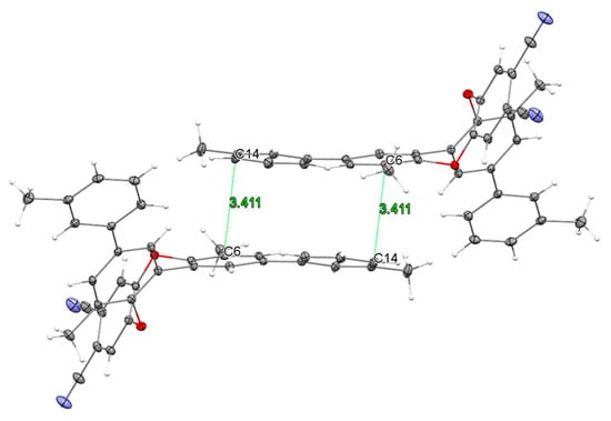 The intramolecular interactions in 4,11-dimethyl-2,13-di-m-tolyltribenzo[b,e,g][1,4]dioxocine-7,8-dicarbonitrile crystal: intermolecular π-π stacking between phenyl rings. Displacement ellipsoids are drawn at the 10% probability level. Hydrogen atoms are omitted. Atom colours: oxygen (red), nitrogen (blue).