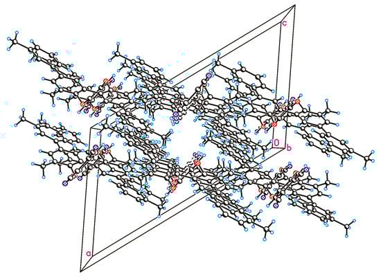 The crystal packing of 4,11-dimethyl-2,13-di-m-tolyltribenzo[b,e,g][1,4]dioxocine-7,8-dicarbonitrile. Atom colours: oxygen (red), hydrogen (blue).