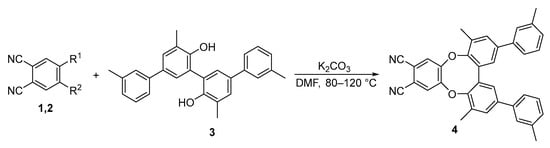 General pathway for 4,11-dimethyl-2,13-di-m-tolyltribenzo[b,e,g][1,4]dioxocine-7,8-dicarbonitrile synthesis. Compound 1: R1 = Br, R2 = NO2 (1); compound 2: R1 = R2 = Cl (2).