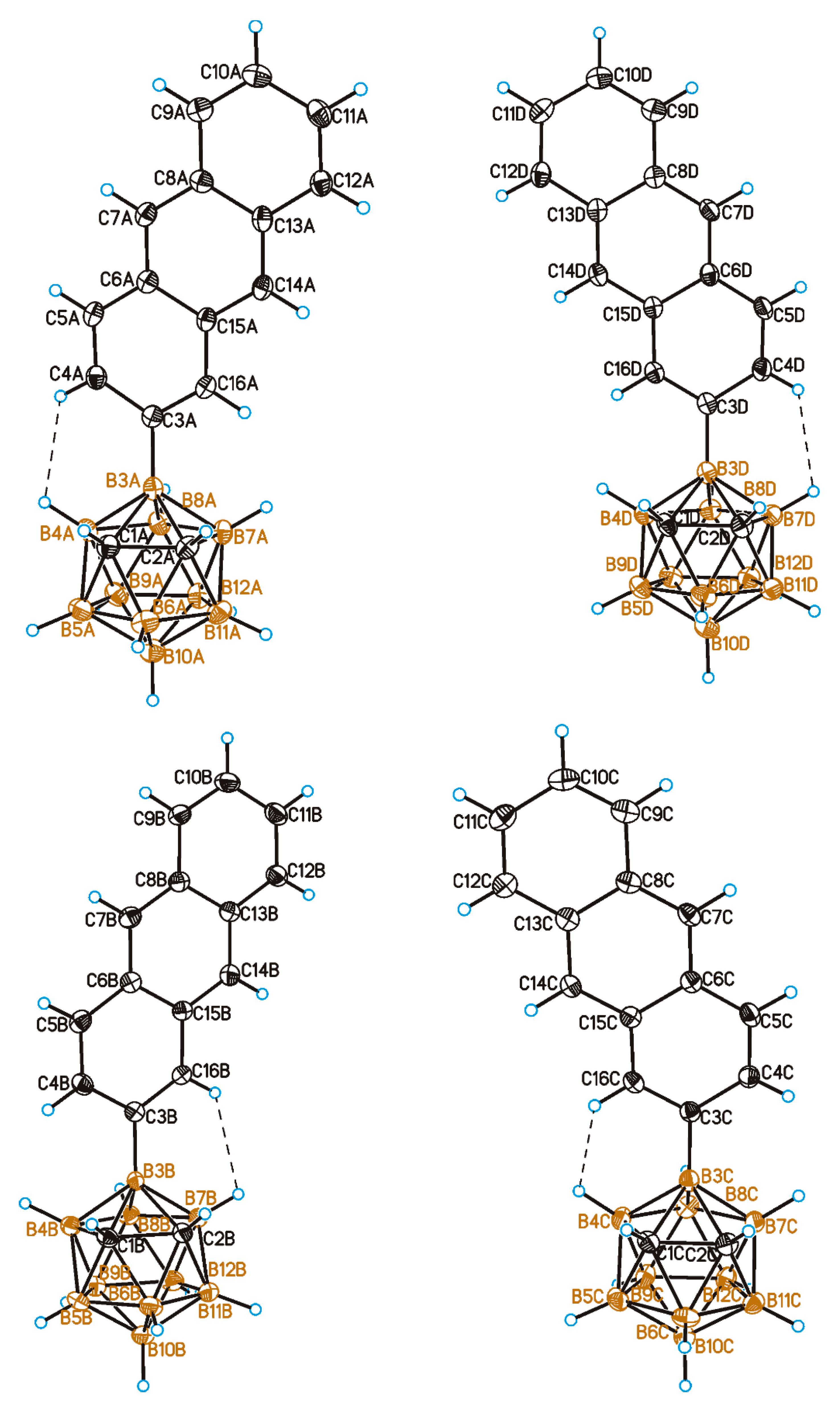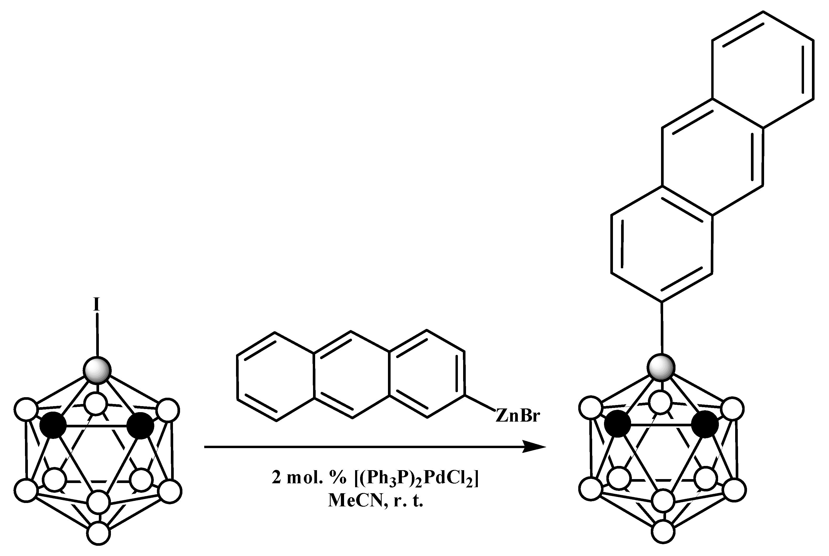 - Shmal’ko, A.V.; Anufriev, S.A.; Suponitsky, K.Y.; Antoshkina, E.P.; Sivaev, I.B.; Bregadze, V.I. Synthesis of B-substituted anthracenyl and pyrenyl derivatives of ortho-carborane. Inorganics 2025, 13, 138. [Google Scholar] [CrossRef]