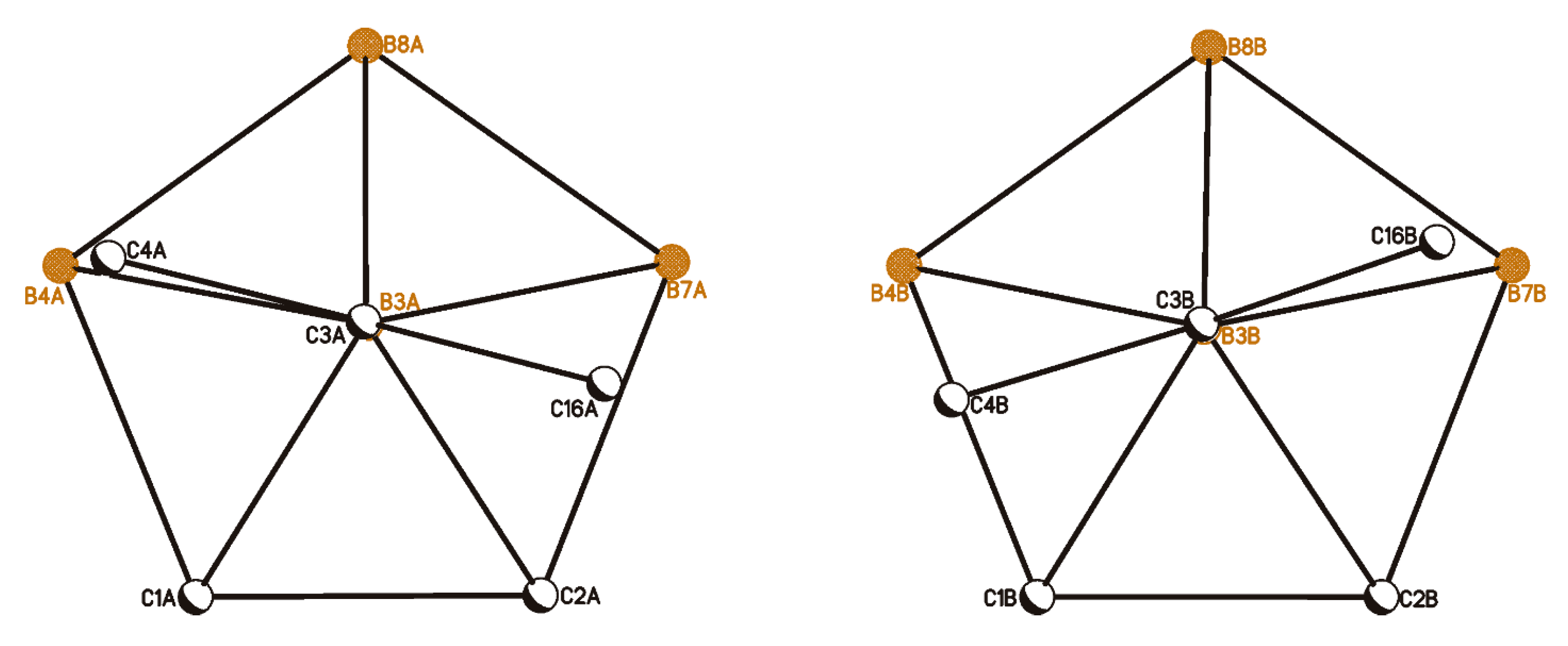 - Viñas, C.; Barberà, G.; Oliva, J.M.; Teixidor, F.; Welch, A.J.; Rosair, G.M. Are halocarboranes suitable for substitution reactions? The case for 3-I-1,2-closo-C2B10H11: Molecular orbital calculations, aryldehalogenation reactions, 11B NMR interpretation of closo-carboranes, and molecular structures of 1-Ph-3-Br-1,2-closo-C2B10H10 and 3-Ph-1,2-closo-C2B10H11. Inorg. Chem. 2001, 40, 6555–6562. [Google Scholar] [CrossRef]