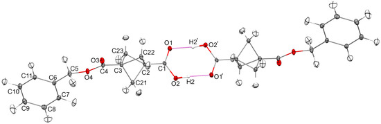 The compound appears to pack efficiently (Figure 2). The Dcalc for the compound is 1.323 g/cm3, which is lower than the average of 1.414 g/cm3 for BCPs disubstituted at the bridgehead positions (356 exemplars [11]). In this diagram, the two central molecules are not H-bonded to each other, e.g., through (½½½); rather, this occurs at (½0½) and (½1½) so that the dimer partners are not in view within the unit cell. The shortest intermolecular contact outside of the H-bonded pairs is that from O1 to ortho benzyl ring H7 at (x, 1/2 − y, −1/2 + z), that is, 0.275 Å < ∑rvdW. Thus, there are no secondary O···H interactions involving the carboxylic acid, whereas these are a prominent feature in the packing of BA [6].