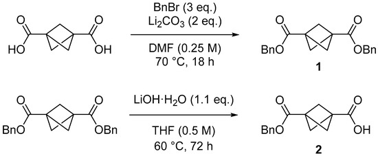 The two-step synthesis of carboxylic acid 2 was carried out successfully. Initially, bicyclo[1.1.1]pentane-1,3-dicarboxylic acid underwent a bis-benzylation in the presence of BnBr and Li2CO3 in DMF to yield diester 1. Classic Fischer-type conditions utilizing BnOH and catalytic H2SO4 were also attempted, but performed poorly compared to basic conditions. Diester 1 was treated with LiOH·H2O in THF to yield the title compound 2 in a 63% yield. Monosaponification of 1 was achieved via careful control of the stoichiometry of the base (1.1 eq. vs. 2 eq.) as well as through precipitation of the carboxylate salt of 2 upon its formation. The free carboxylic acid 2 was then purified via flash chromatography and isolated as a white solid.