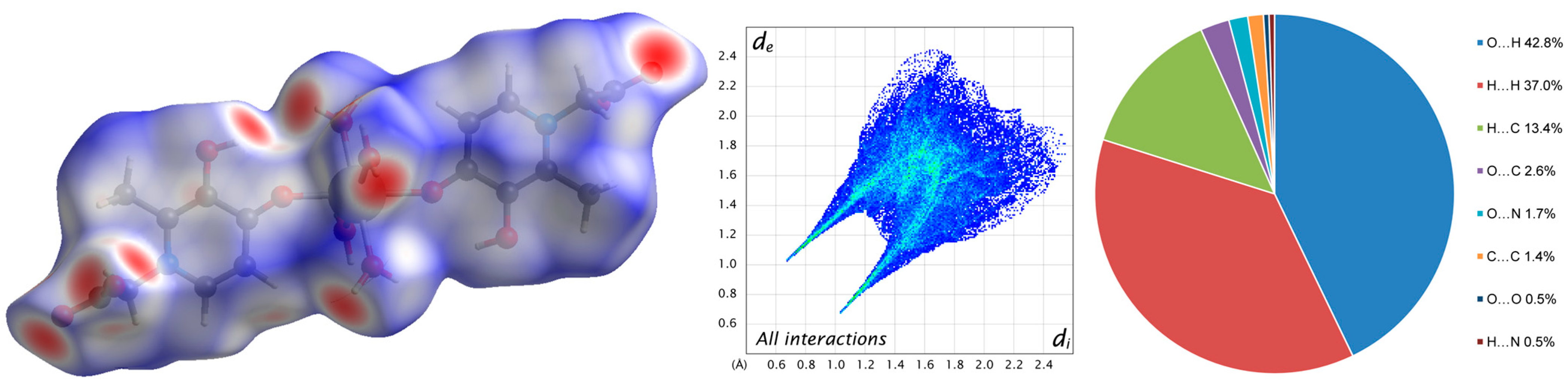 - Spackman, P.R.; Turner, M.J.; McKinnon, J.J.; Wolff, S.K.; Grimwood, D.J.; Jayatilaka, D.; Spackman, M.A. CrystalExplorer: A program for Hirshfeld surface analysis, visualization and quantitative analysis of molecular crystals. J. Appl. Cryst. 2021, 54, 1006–1011. [Google Scholar] [CrossRef]
