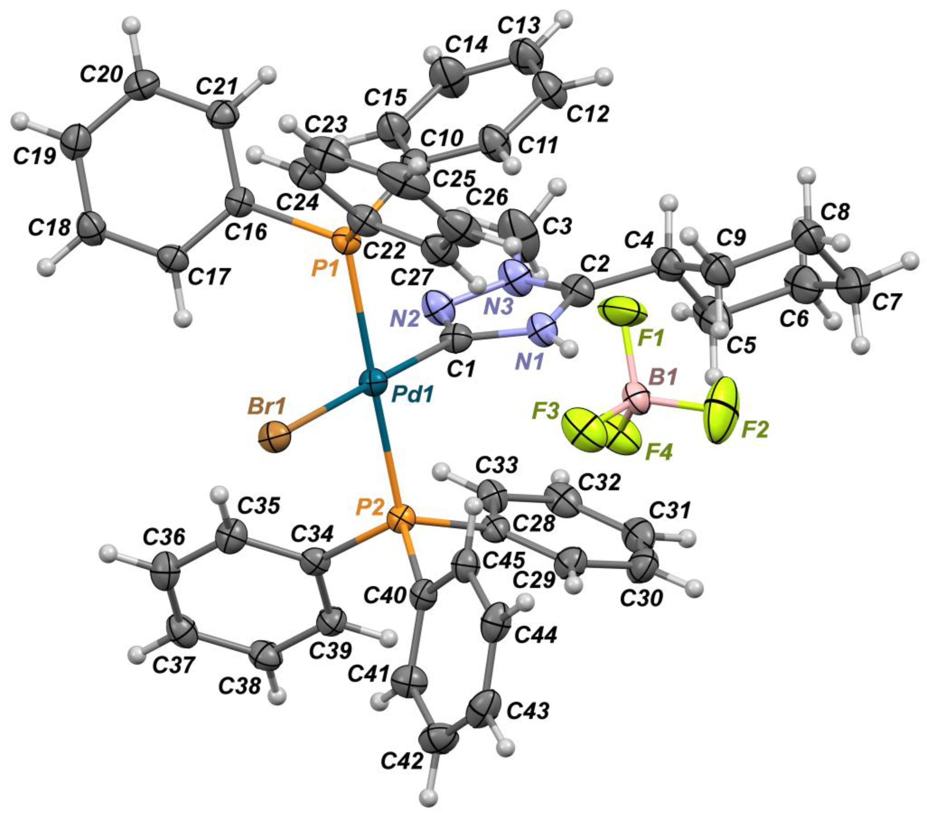 Bromo(5-cyclohexyl-1-methyl-1H-1,2,4-triazol-4-ium-3-yl)bis(triphenylphosphane)palladium Tetrafluoroborate