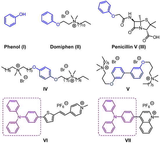 Phenol is characterized by a hydroxyl group directly attached to a benzene ring (Figure 1I). It gained prominence after serendipitously discovering its efficacy in disinfecting surgical instruments, leading to its widespread use as a potent surgical antiseptic. Moreover, the phenoxy group is extensively incorporated into various bioactive molecules, such as the disinfectant domiphen and the antibiotic penicillin V (Figure 1II,III). Based on this structural feature, our research group previously introduced the phenoxy group as an aromatic core into the design of quaternary ammonium salt-based small-molecule antimicrobial peptide mimics, successfully obtaining compounds with promising antibacterial activity (Figure 1IV,V) [,]. Therefore, phenol derivatives are considered ideal structural motifs for constructing multifunctional antibacterial agents.