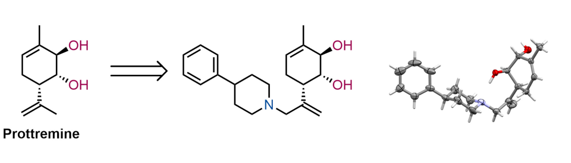 Parkinson’s disease (PD) is a progressive neurodegenerative disorder whose primary manifestation is motor dysfunction. Previous research showed that (1R,2R,6S)-3-methyl-6-(prop-1-en-2-yl)cyclohex-3-ene-1,2-diol (Prottremine) exhibits potent antiparkinsonian activity in animal models of PD, with an efficacy comparable to levodopa. Herein, we report the synthesis of a new Prottremine derivative, (1R,2R,6S)-3-methyl-6-(3-(4-phenylpiperidin-1-yl)prop-1-en-2-yl)cyclohex-3-ene-1,2-diol. The compound was fully characterized and its structure was confirmed through single-crystal X-ray diffraction analysis.