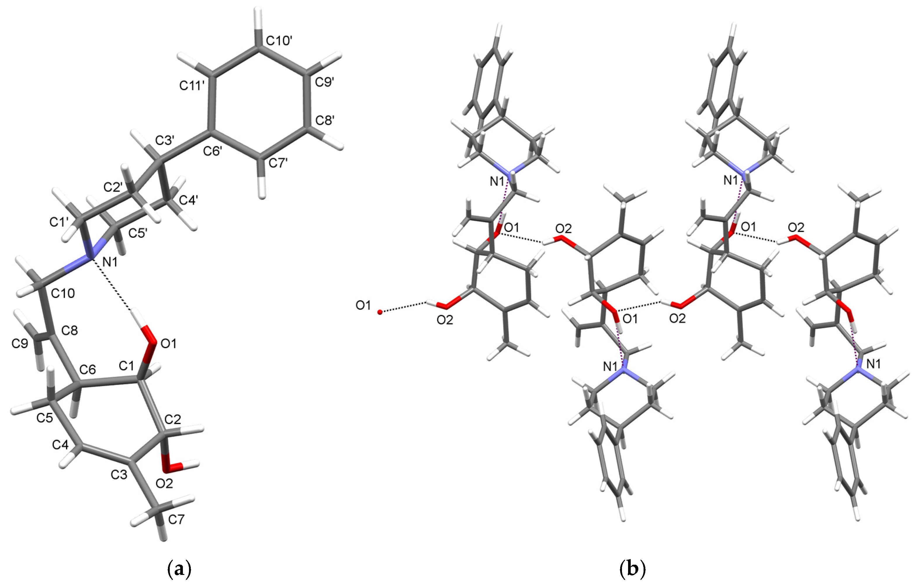 The piperidine cycle has a chair conformation with sp3-hybridizied nitrogen atom which deviates from the plane C10C1′C5′ by 0.454(3) Å. Phenyl substituent on C3′ lays in axial position to piperidine cycle and is oriented with torsional angle C2′C3′C6′C7′ equaling to 75°. The hexene cycle adopts half-chair conformation, atoms C2–C5 lay in common plane in the limits of ±0.003(3)Å while atoms C1 and C6 deviate from this plane by 0.388(4) and 0.398(4) Å correspondently. Both hydroxy groups on cyclohexene ring are axial and oriented along intramolecular O1-H…N1 (Figure 1a) and intermolecular O2-H…O1 (Figure 1b) H-bonds. The strong intramolecular H-bond O1-H…N1 between the nitrogen atom of the piperidine ring and the hydroxyl group at position 1 restricts rotation around single bonds of N1C10C8C6 moiety, thus forming six-membered cycle C10C8C6C1O1(H)…N1 which adopts a distorted chair conformation with absolute values of torsion angles being in the range from 41 to 76°. Due to the intermolecular O2-H…O1 hydrogen bond, the molecules in crystals are organized to hydrogen-bonded chains along axis a with head-to-tail orientation of neighboring molecules (Figure 1b). The parameters of these bonds are as follows: distances O-H—0.89(4) and 0.85(5), H…O—1.85(4) and 2.12(5) and O…N/O—2.714(3) and 2.907(3)Å, angles O-H…N/O 164(4) and 154(4)° for O1-H…N1 and O2-H…O1, respectively. There are no other significant intermolecular short contacts or interactions affecting the crystal packing.