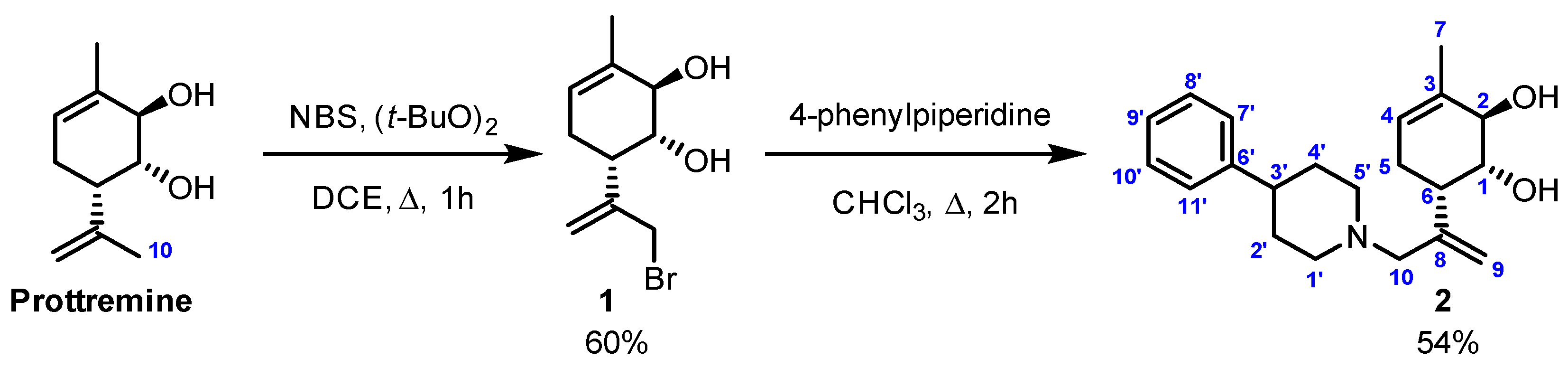 The synthesis of (1R,2R,6S)-3-methyl-6-(3-(4-phenylpiperidin-1-yl)prop-1-en-2-yl)cyclohex-3-ene-1,2-diol began with the preparation of bromide 1 which was synthesized following an improved procedure by boiling Prottremine and N-bromosuccinimide (NBS) in the presence of (t-BuO)2 in 1,2-dichloroethane, the product yield being 60% [15]. Reaction of bromide 1 with phenylpiperidine was carried out in chloroform by refluxing for 2 h. After purification by column chromatography on SiO2 product 2 was isolated with 54% yield (Scheme 1).