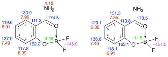 The compound 3 was readily prepared for spectroscopic study by stirring a mixture of salicylamide and BF3·Et2O in diethyl ether at 0 °C. The resulting solid showed a melting point in good agreement with the literature value []. It was readily soluble in CDCl3, but since the only literature NMR data were recorded in CD3OD, we studied it also in that solvent. The simple one-dimensional spectra gave chemical shifts in the expected range for 1H, 13C, 11B and 19F and by obtaining COSY, HSQC and HMBC spectra (see Supplementary Materials) a complete unambiguous assignment was possible (Figure 1) showing good agreement between the data in the two different solvents.