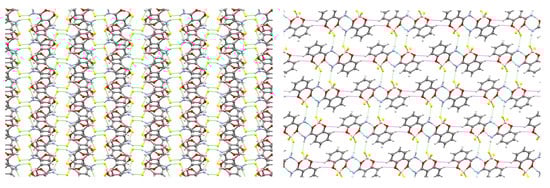 The crystal structure of Form A consists of slip-stacked sheets in the (1 0 0) plane (Figure 5) formed by (12) rings of N–H···F hydrogen bonds (Table 3). In contrast, Form B’s hydrogen-bonded dimers link together through non-classical C–H···O hydrogen bonds to form sheets in the (1 0 1) plane, which stack together through N–H···F hydrogen bonds (Figure 5, Table 3).