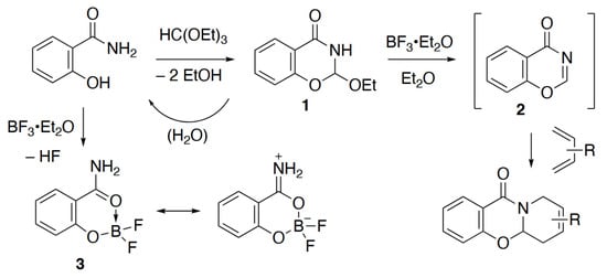 - Ben-Ishai, D.; Warshawsky, A. The reactions of 2-ethoxy-2,3-dihydro-4H-1,3-benzoxazin-4-one with conjugated dienes. J. Heterocycl. Chem. 1971, 8, 865–866. [Google Scholar] [CrossRef]