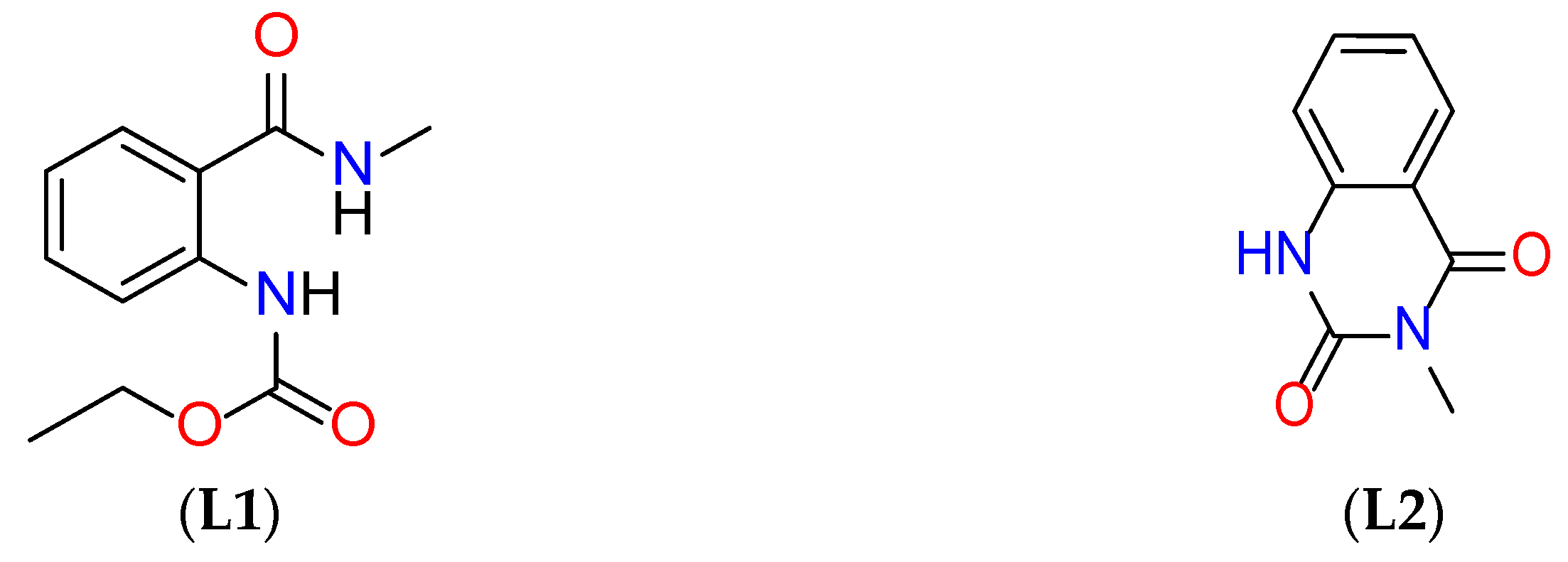 3.3. Synthesis of Cu(II) Complex of Ethyl (2-(Methylcarbamoyl)phenyl)carbamate (L1) and 3-Methylquinazoline-2,4(1H,3H)-dione (L2)–General Procedure