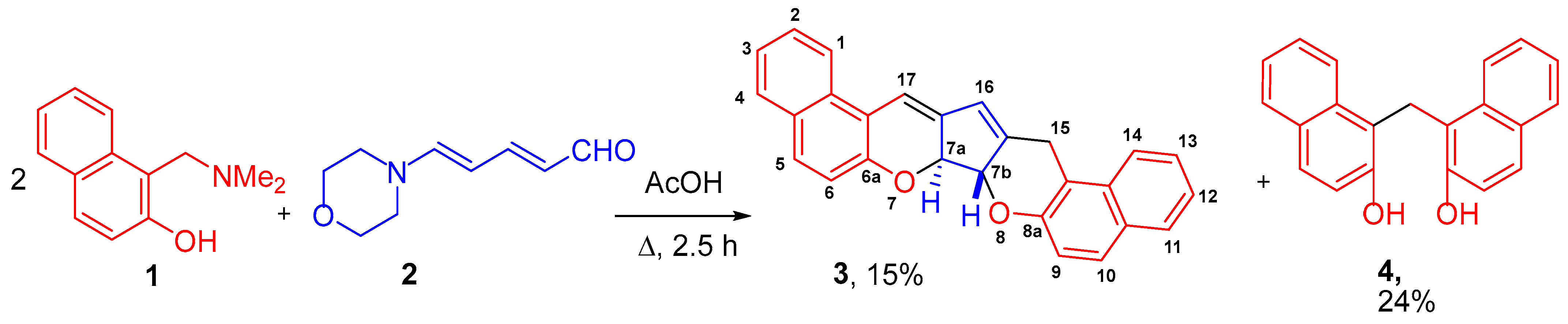 3.1. Synthesis and Characterization of (7aR*,7bR*)-7a,7b-Dihydro-15H-dibenzo[f,f′]cyclopenta[1,2-b:5,4-b′]dichromene (3)