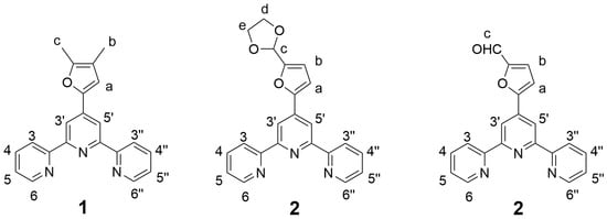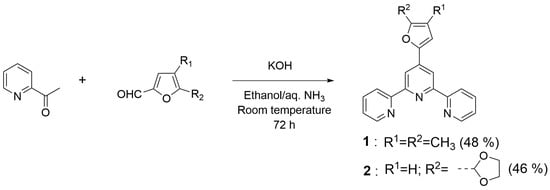 Terpyridines 1 and 2 were prepared in the same way, starting from 2-acetylpyridine and 4,5-dimethylfuran-2-furaldehyde or 5-(1,3-dioxolan-2-yl)-2-furaldehyde, respectively, using a Kröhnke reaction [15,16]. The specific protocol that was used is a one-pot procedure in which the terpyridine precipitates from the reaction mixture [17]. They are recovered by simple filtration, and after washing with ice-cold ethanol, analytically pure (as determined by quantitative 1H NMR using ethylene carbonate as internal standard) compounds were obtained albeit in moderate yields (Scheme 1).