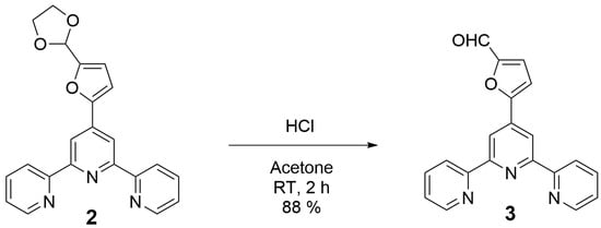 The last ligand, 4′-(5-formylfuran-2-yl)-2,2′:6′,2″-terpyridine (3), is simply obtained from compound 2 via acidic hydrolysis of acetal moiety (Scheme 2). The reaction was carried out using concentrated hydrochloric acid [18]. By doing so, terpy 3 was obtained in 88% yield. Once again, the product was analytically pure without the need for purification. Attempts to prepare 3 by other synthetic pathways (for instance oxidation of a primary alcohol) have failed so far.