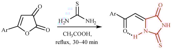 Earlier, the formation of 2-thioxoimidazolidin-4-ones was described by refluxing 5-arylfuran-2,3-diones with thiourea in 15 mL of anhydrous acetic acid for 30–40 min (Scheme 1) [7].